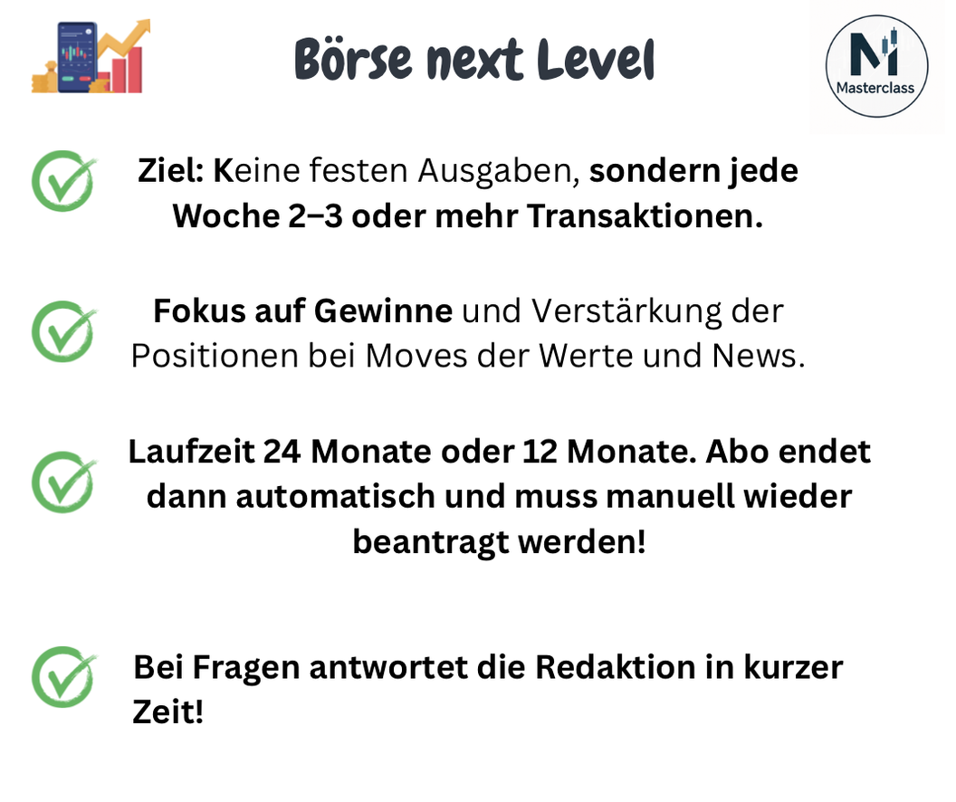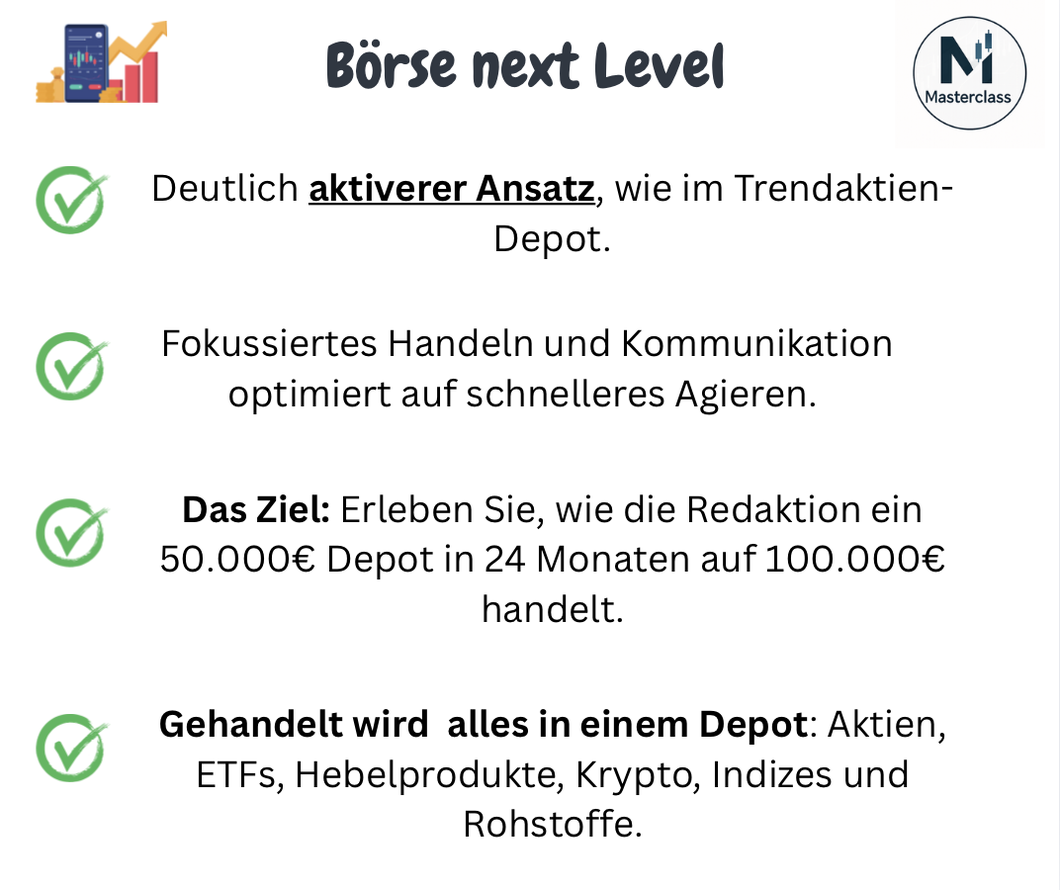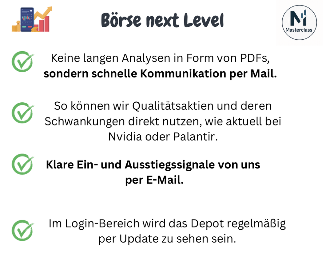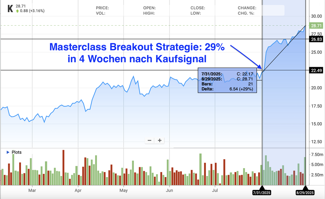 Ein Ansatz der MASTERCLASS wird die Breakout-Strategie sein. Natürlich gibt es auch weitere Ansätze, mit Qualitätsaktien schnelle Bewegungen zu nutzen. Wir screenen dann ständig die Märkte und nutzen diese Bewegungen für uns aus. Sie erhalten dann per E-Mail sofort die Ideen von uns mitgeteilt. So können Sie die Trades direkt umsetzen.
